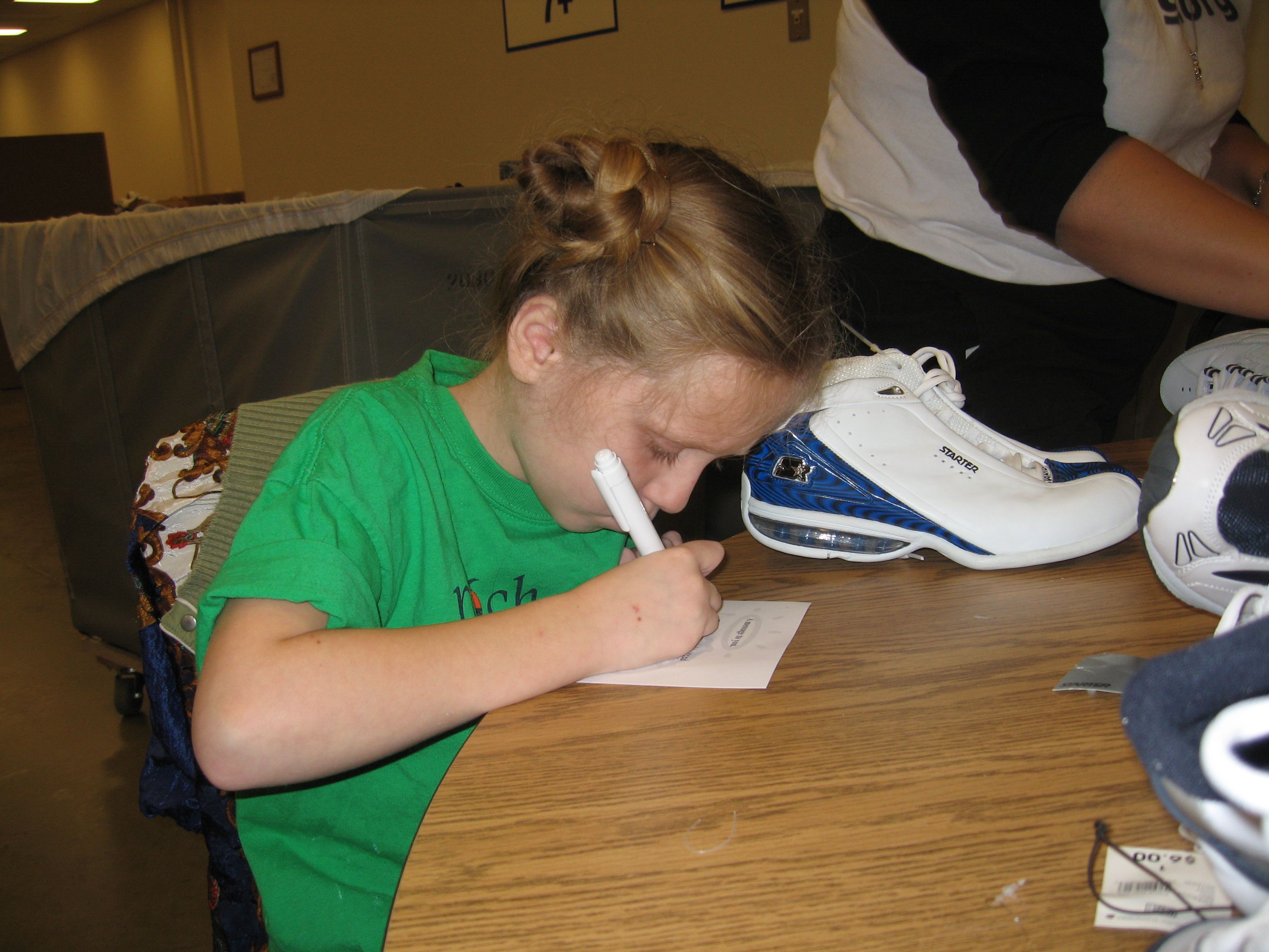 Who will wear the tiny, size 4, bright pink infant girl tennis shoes? I held them in my hands and prayed for that tiny baby girl. What little boy will feel the solid sole of these Nike Air tennis shoes, big-kid size 3? I prayed for him as I removed the paper stuffing and strung a ziptie through the shoelace hole. Cadi stuck notes in some of the shoes. She wrote poems and notes of encouragement. Other kids drew pictures. I mentally tucked kisses inside each shoe. I pray the Lord will spread my kisses and that these children will feel loved.