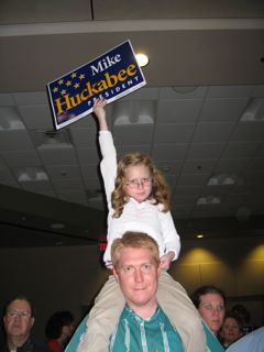 The fact that Perry is so vocal about Huckabee pulling out of the race is indicative of his fear that Huckabee will WIN Texas. Oh no! That means Perry backed the losing team two times in a row, doesn’t it? Huckabee had a rally in Texas last week, and we were fortunate enough to attend. The energy was amazing! We arrived nearly an hour early, and the room was already packed “standing room only.” We wormed our way to the front by snaking along the side wall. The folks were very nice to let us through since we had a young supporter in tow who wanted to be close enough to see Governor Huckabee when he spoke.