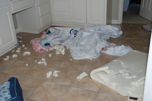 After seeing this mess in my bathroom, I felt a good dose of wrath building up inside me at my dog. This disaster was made by the same dog who was sick last week. He is still recovering from his illness but obviously felt well enough to tear into his bed in the middle of the night! It makes me suspicious that the “suspicious spot” in his stomach might have been a piece of memory foam…I love this goofy dog, but honestly! I have cleaned up his vomit and diarrhea and washed blankets and bleached the floor and petted him and fed him special food and spent way too much money on xrays and medication at the vet….and this is the thanks I get?
