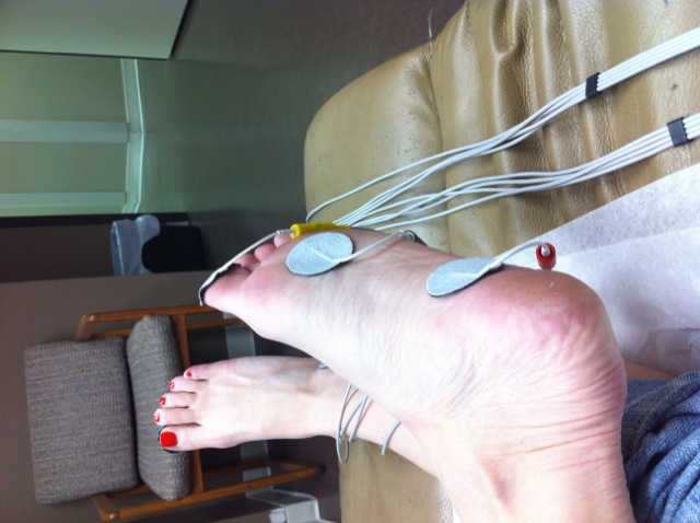 And here’s a photo of my lovely feet with electrodes attached. The machine is also connected by wire thermistors which constantly keep tabs of the temperature of my index fingers. This is because skin temperature is a direct indicator of the amount of VIP in a person’s body due to the increased level of circulation that occurs when VIP production is high.