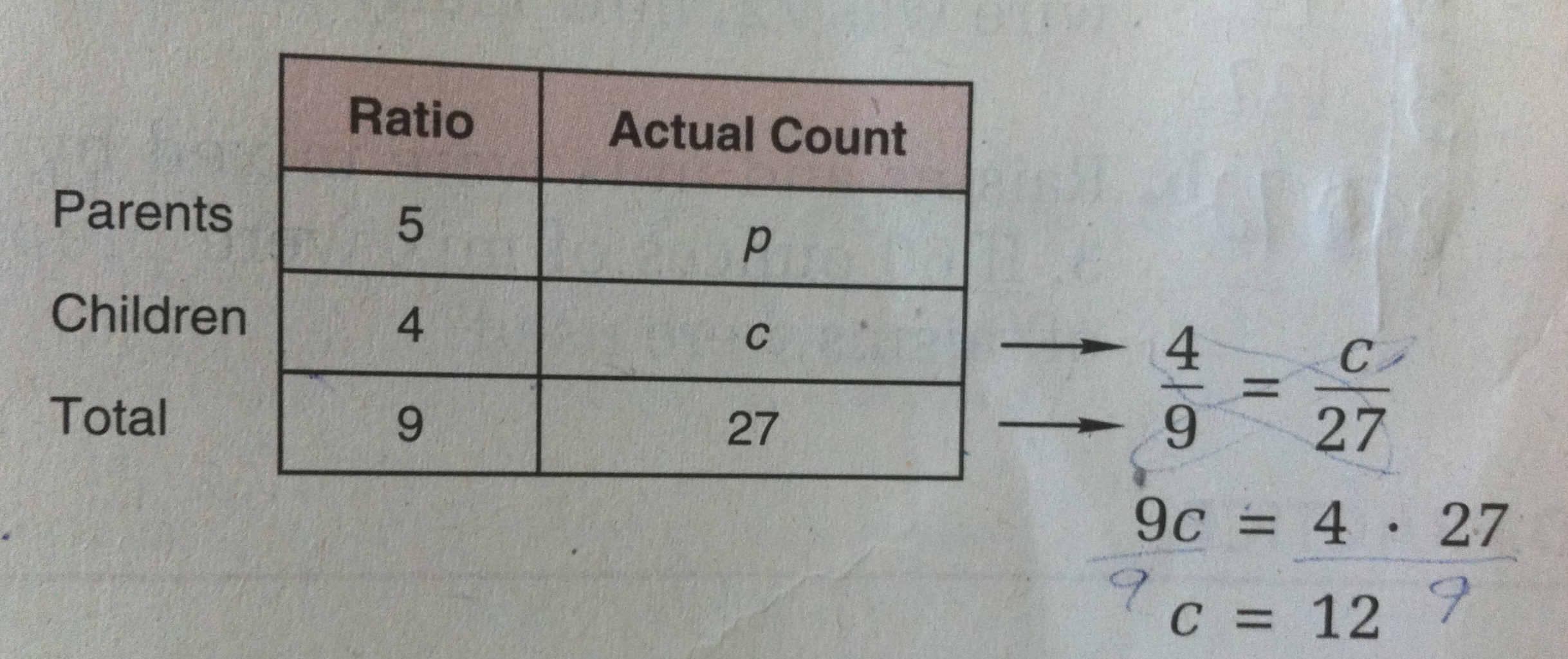 Puzzled at the lengthy explanation and multi-step process, my daughter just looked at the chart and said, “27 divided by 9 is 3…so that means there are 12 children and 15 parents when the ratio of parents to children is 5 to 4.”  Somehow her brain saw the answer without needing to go through the steps.
