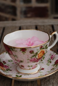 I love this teacup and saucer. It’s the only one I have in this pattern, and I got it in an auction basket for a school my daughter attended years ago. All the tea is gone, but I kept the cup. Tea makes the world a bit sweeter. But not if you drink it with an oleander blossom, as shown in this photo. Then it would make life a bit shorter. (Oleanders are one of my favorite blooming plants…sadly they are toxic to pets and probably humans, too.)