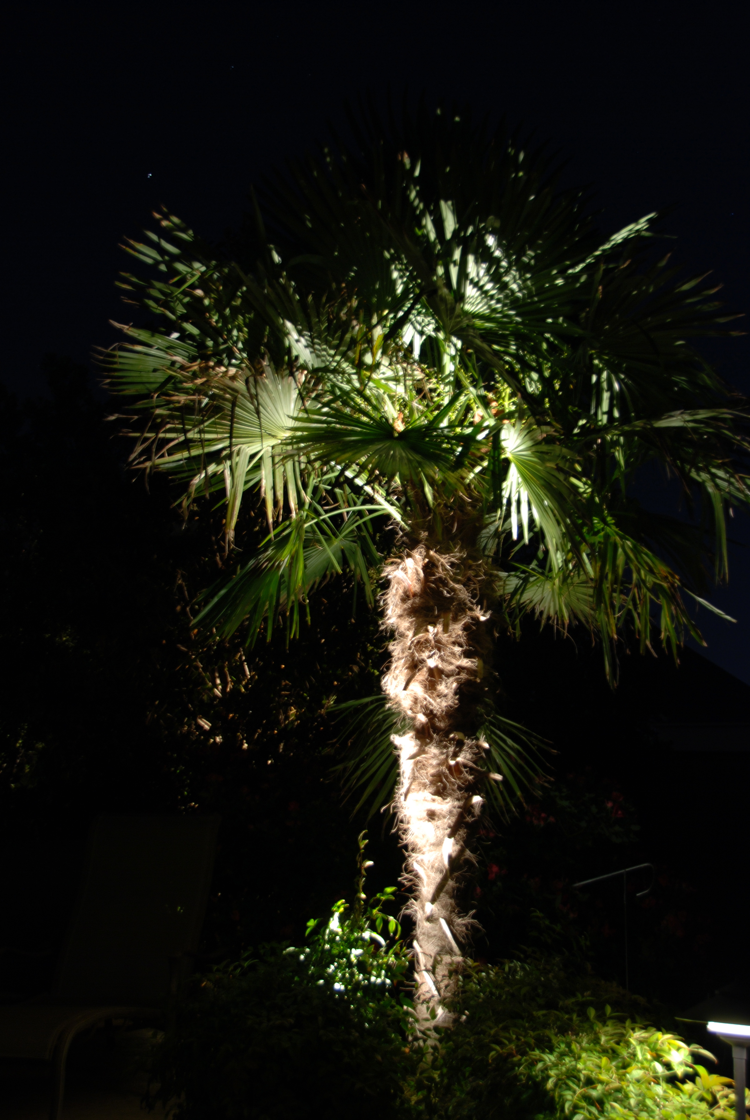 Palm trees all lit up at night, like a paintbrush illustrating the sky.