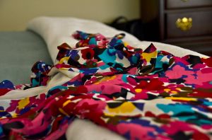 So far I’ve placed about 50 items into two lawn-size trash bags, destined for charity. I found many lumpy sweaters that I never wore before as well as a “springy” dress that I bought on a whim three years ago…and have not yet worn outside the privacy of my closet. Every time I put it on, I feel like an over-iced cupcake. Or a clown. I’ll file this one in the “what in the world was I thinking?” column.