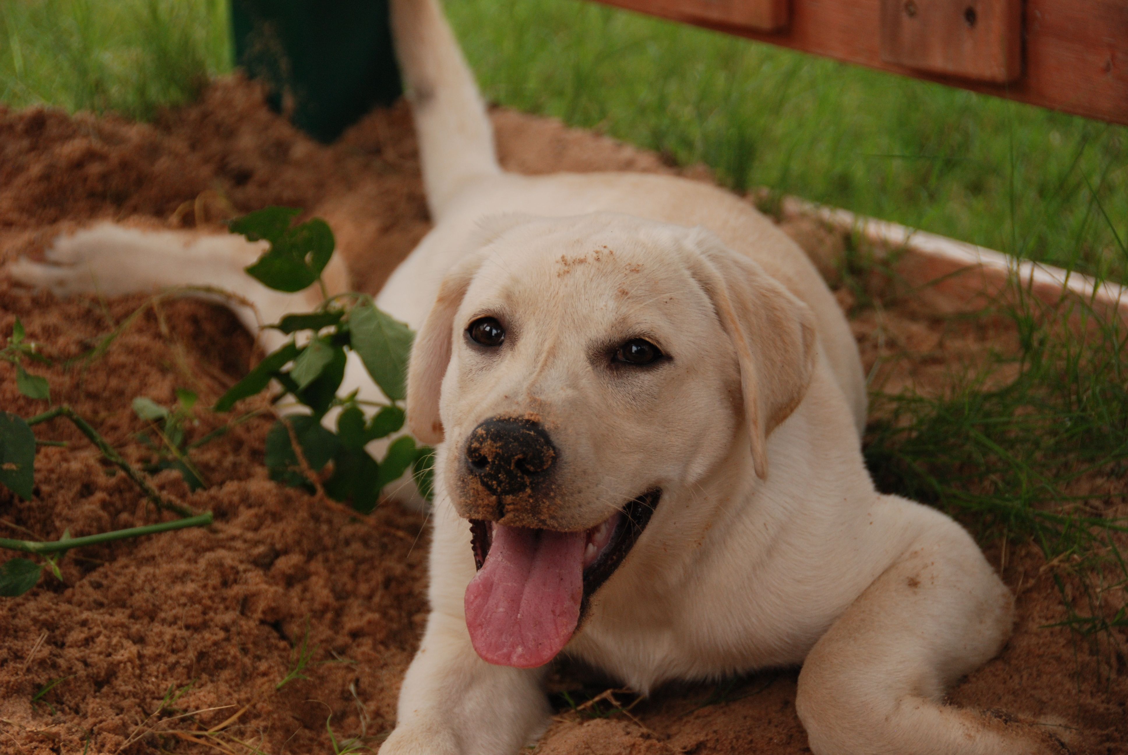 The story here is a bit obvious — Bella has been joyfully digging. A lot. She is reveling in the feel of the grunge on her face and the coolness of the sand under her belly. It was one of those super-hot Texas summer afternoons. After this picture was shot, she took off for the pool to do a little wading and muddying!