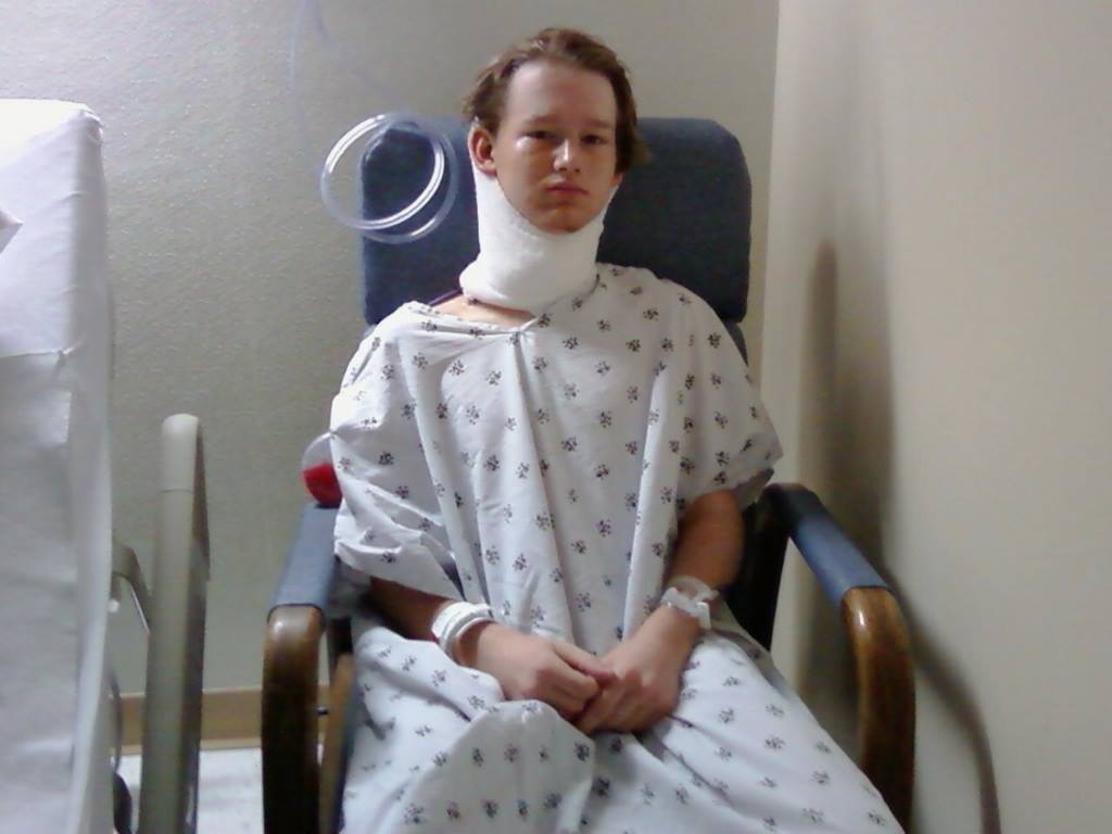 This is what radical neck dissection looks like afterwards. Doctors removed the rest of the thyroid, two parathyroid glands, and 30 lymph nodes from under his ear, jawline, neck and upper chest.