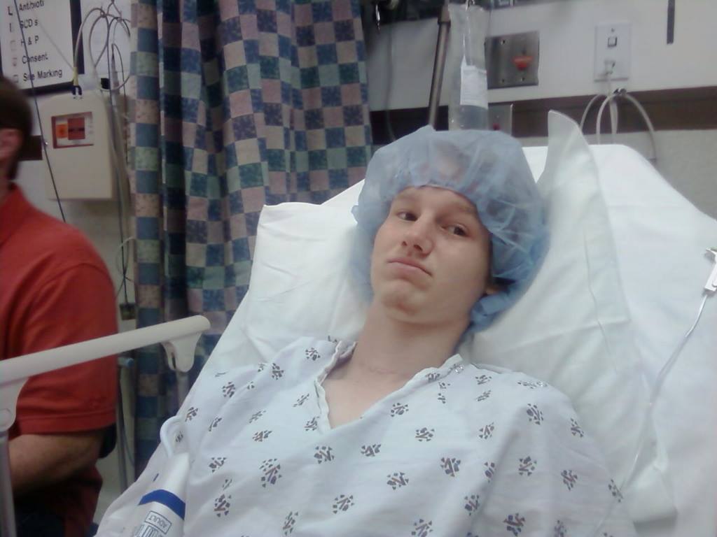 Fast forward eight years to 2010, when CancerSlayer lifts his sword again towards cancer, this time of his thyroid. Here he is in pre-op for his second thyroid surgery in a month. A previous surgery revealed the thyroid cancer was metastatic.
