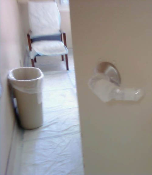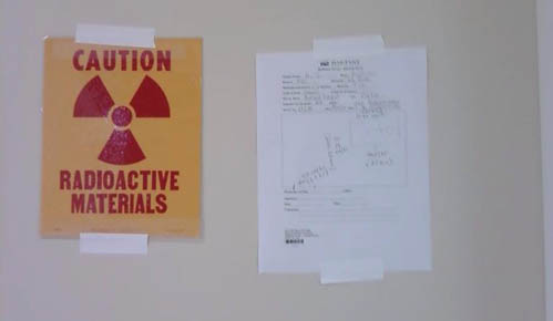 This is a bit of a look into his isolation chamber. The medical staff taped bed padding down to the floor and chairs, and they taped coverings to items that nurses would come in contact with. This precaution prevented radioactive by-products from contaminating surfaces. The safety precautions created a safer clean up.