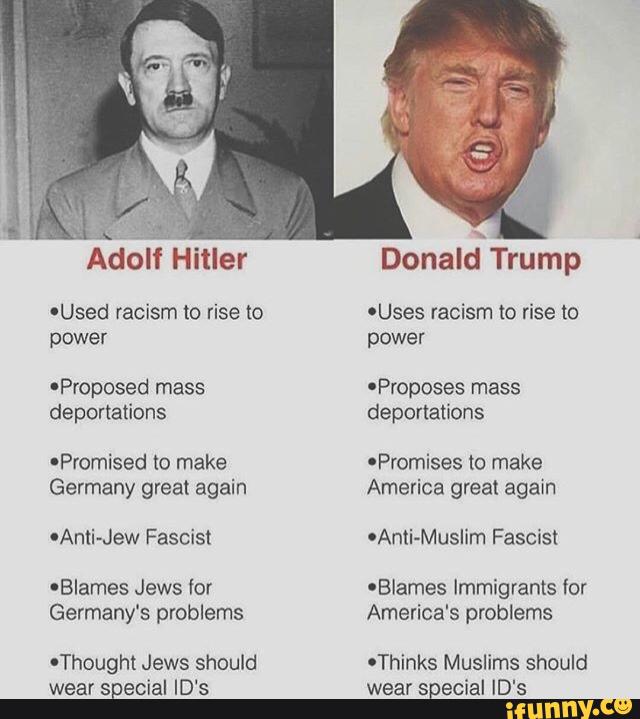 Hitler was immensely popular. He rapidly rose to power on a wave of anti-Jew, anti-negro sentiment. Donald Trump is rapidly rising to power on a wave of anti-Muslim, anti-immigrant sentiment. His views on government authority are alarming (see the above comparison between his words and Reagan’s words). He will not repudiate the support of David Duke and the KKK. The similarity between the two is frightening, and I shared it not out of hate, but out of a genuine concern that history will repeat itself. What would President Trump do when it became impossible to have mass deportations of immigrants? Would he direct the INS to go door to door, rounding up the illegals?