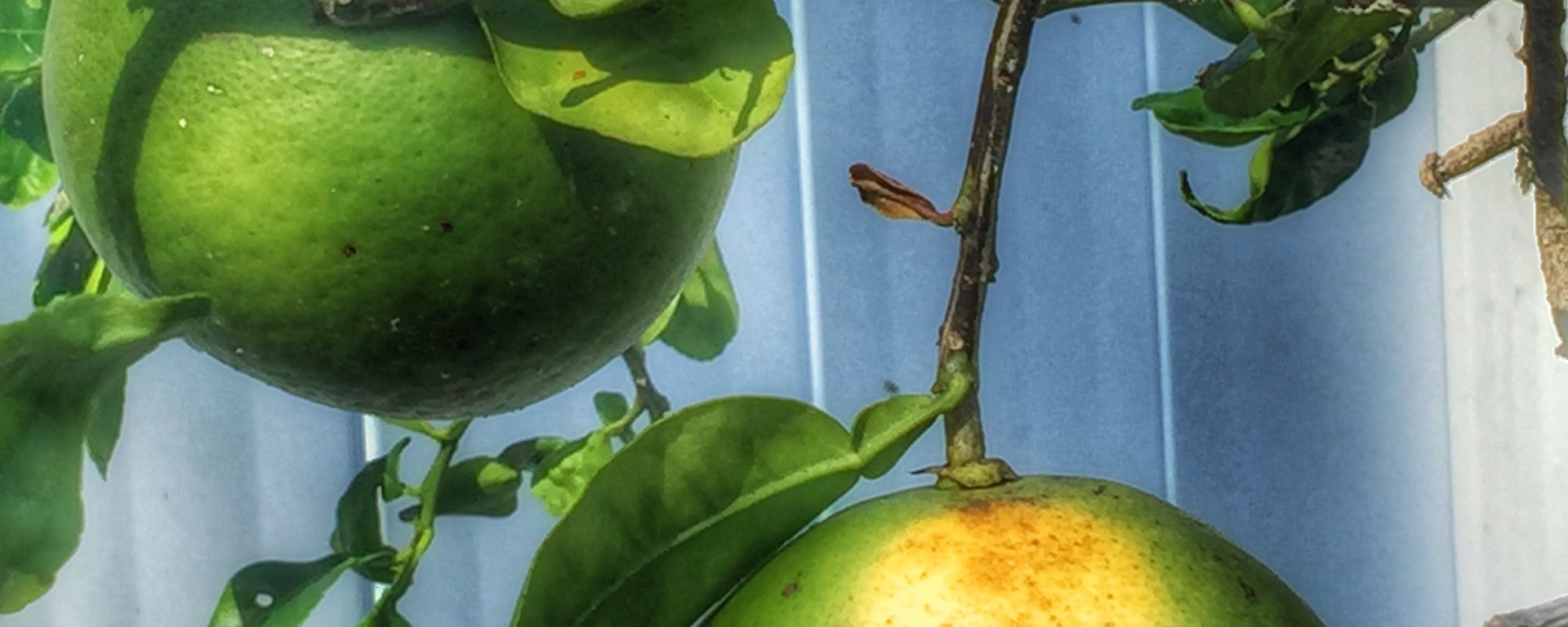 Many broken branches are piled up at the end of our driveway, a reminder of the hurricane that barely brushed our county but brought hurricane-force winds anyway. This fruit that survived the winds is a natural hybrid. It’s somewhere between an orange and a lime; the exterior is green like a lime, and the fruit within tastes orangey with a hint of tart lime: a l’orange! Or maybe an orlime? A limornge? Only in Florida!